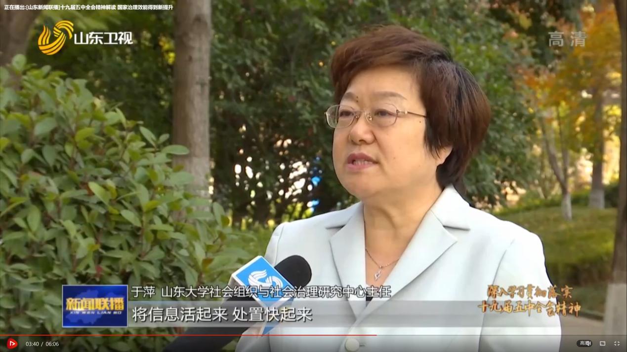 日前,为深入学习贯彻党的十九届五中全会精神,齐鲁网、闪电新闻策划推出“党的十九届五中全会精神”解读专栏。山东大学生活质量与公共政策研究中心专任研究员于萍参与访谈活动,对全会精神进行解读。对此活动,学习强国发表专稿《“党的十九届五中全会精神”系列解读⑥:国家治理效能得到新提升》。