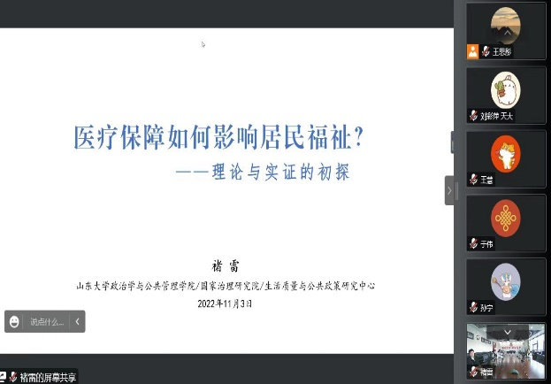 本次讲座以“医疗保障如何影响居民福祉?——理论与实证的初探”为主题,褚雷老师以生动精彩的语言精准地阐明了基本医疗保险的地位与现状。他指出,当前我国已建立起世界上最大的基本医疗保障体系,考察评估医保政策的实施效果成为各界的关注焦点。褚雷老师从“生活质量理论”入手,借鉴可行能力理论的分析框架,通过考察验证功能性活动的中介效应构建得出基本医疗保险幸福效应机制模型。结合山东省居民生活状况实地调查数据进行深刻分析和对比,采用结构方程模型对基本医疗保险对居民幸福感的影响及作用机制进行了实证分析,讲座的最后,褚雷老师根据研究结果提出了相应的政策启示,同时结合党的二十大提出的新征程新任务就开展后续研究提出了思考和展望。