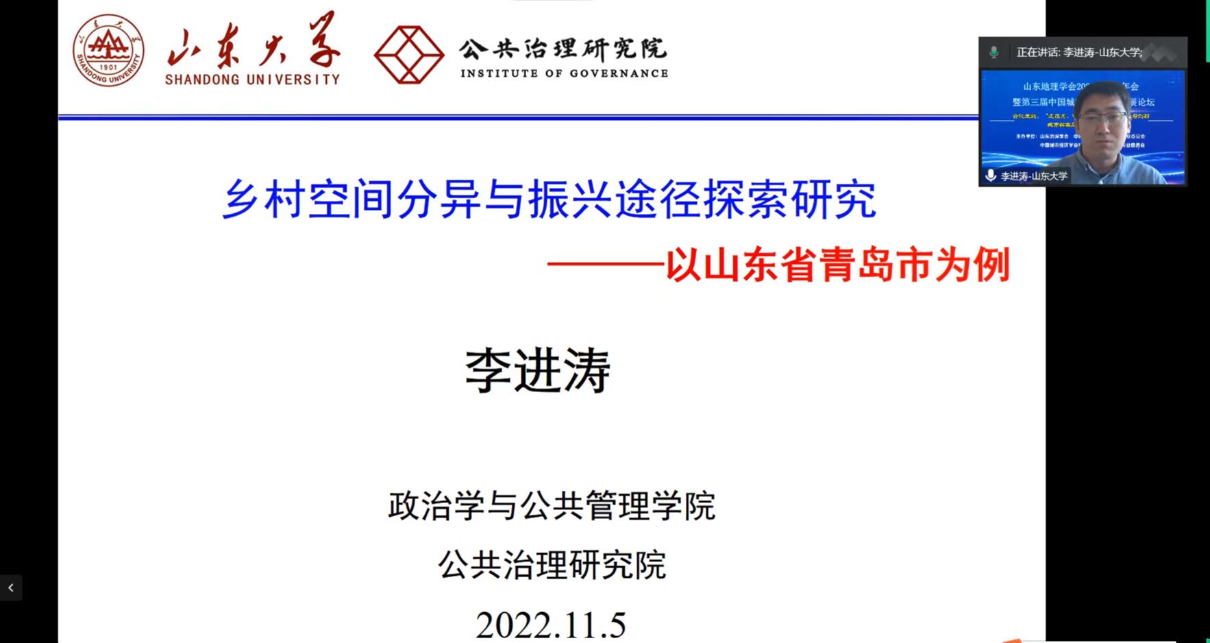本次会议以“‘走在前、开新局’的地理学使命与创新城市群高质量发展新格局”为主题,设置了主题报告和分会场报告交流等环节。中心专任研究员李进涛副教授在“经济地理与地理教学”分会场作了题为“乡村空间分异与振兴途径探索研究——以山东省青岛市为例”的报告。报告首先介绍了基于区位理论,集成市场区位、交通区位与自然区位的点—轴—域三维空间区位理论模型框架;其次,结合耦合协调模型综合研判青岛市乡村的振兴极与不同耦合协调区的发展途径;最后,基于三维空间区位理论模型,对“一村一品”示范村镇空间分异机制进行了应用拓展分析。三维空间区位理论模型的提出对明确乡村振兴攻势与准确定位各类型区乡村振兴实施策略具有重要的借鉴意义。经专家组评审,该作品荣获论文一等奖。