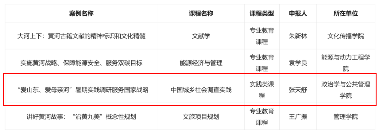 近日,山东省高等学校课程思政研究中心公布了山东省本科高校黄河重大国家战略课程思政优秀案例名单,山东大学生活质量与公共政策研究中心专任研究员张天舒申报的课程案例“‘爱山东、爱母亲河’暑期实践调研服务国家战略”成功入选。