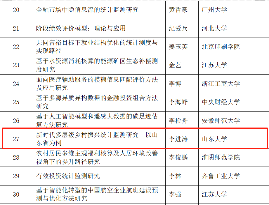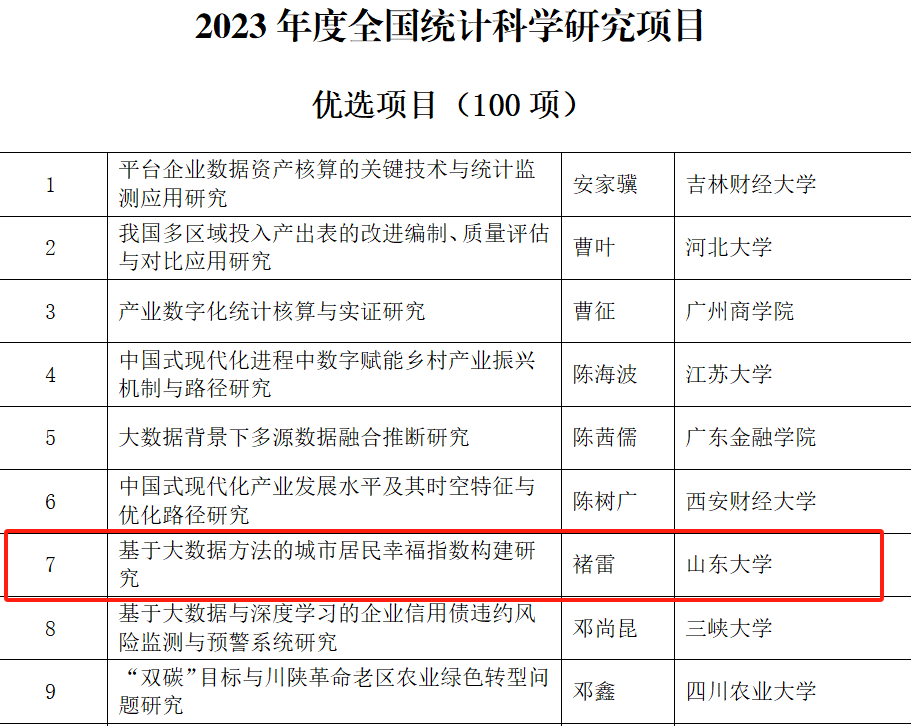 日前,全国统计科学研究组织管理办公室公布了2023年度全国统计科学研究项目立项名单。中心副主任、专任研究员李进涛的《新时代多层级乡村振兴统计监测研究—以山东省为例》、中心专任研究员褚雷的《基于大数据方法的城市居民幸福指数构建研究》获批优选项目。此次全国统计科学研究立项充分彰显了中心服务地方与决策支持的新型智库作用。