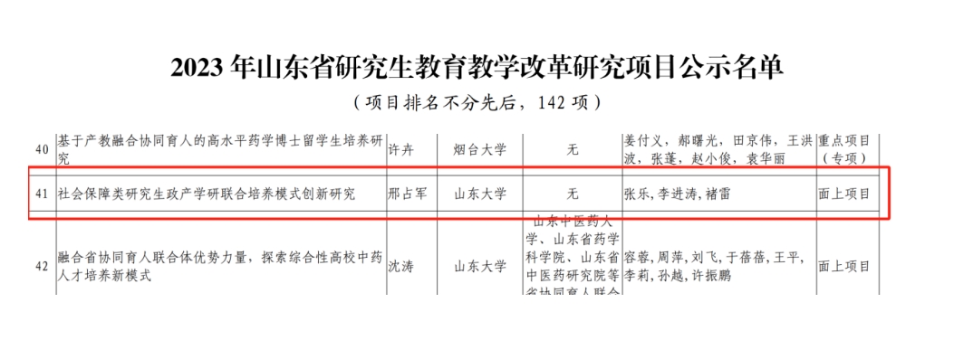 近日,山东省教育厅公布了2023年研究生导师指导能力提升和优质教育教学资源等项目评审结果,由中心研究员邢占军主持,中心研究员张乐、李进涛、褚雷等作为成员申报的《社会保障类研究生政产学研联合培养模式创新研究》获批立项。该项目以理论学习—实验教学—实践训练—社会应用为研究思路,通过数字化资源数据库、情境模拟实验场和实践实训基地的建设路径,探索构建社会保障类研究生政产学研用一体化的联合培养创新模式,积极回应新文科背景下社会保障类高层次专业人才培养模式创新的理论范式变革,将有助于加快提升社会保障类研究生实践应用能力、科研创新能力和跨学科综合能力,为我国社会保障高层次专业人才培养提供有力理论和实践支撑。