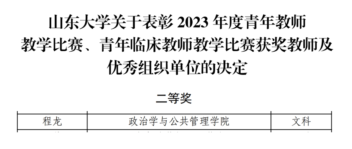 近日,学校公布了2023年度青年教师教学比赛结果,中心研究员程龙荣获二等奖,并被授予“山东大学青年教学能手”称号。
