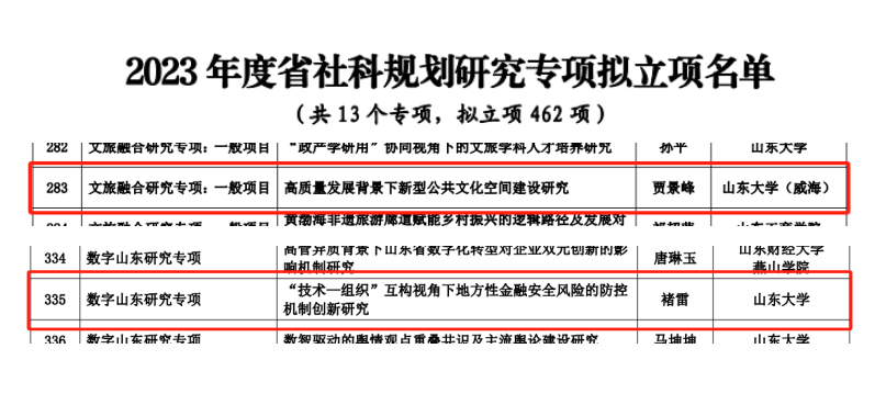 日前,山东省哲学社会科学工作办公室公布了2023年度省社科规划研究专项立项名单。2023年度山东省社科规划13个研究专项经过通讯初评、会议评审,共评选出拟立项项目462项。其中,中心研究员褚雷的《“技术—组织”互构视角下地方性金融安全风险的防控机制创新研究》获批数字山东研究专项,中心研究员贾景峰的《高质量发展背景下新型公共文化空间建设研究》获批文旅融合研究专项一般项目。此次立项对于促进中心公共治理研究,增强学科影响力具有重要意义。