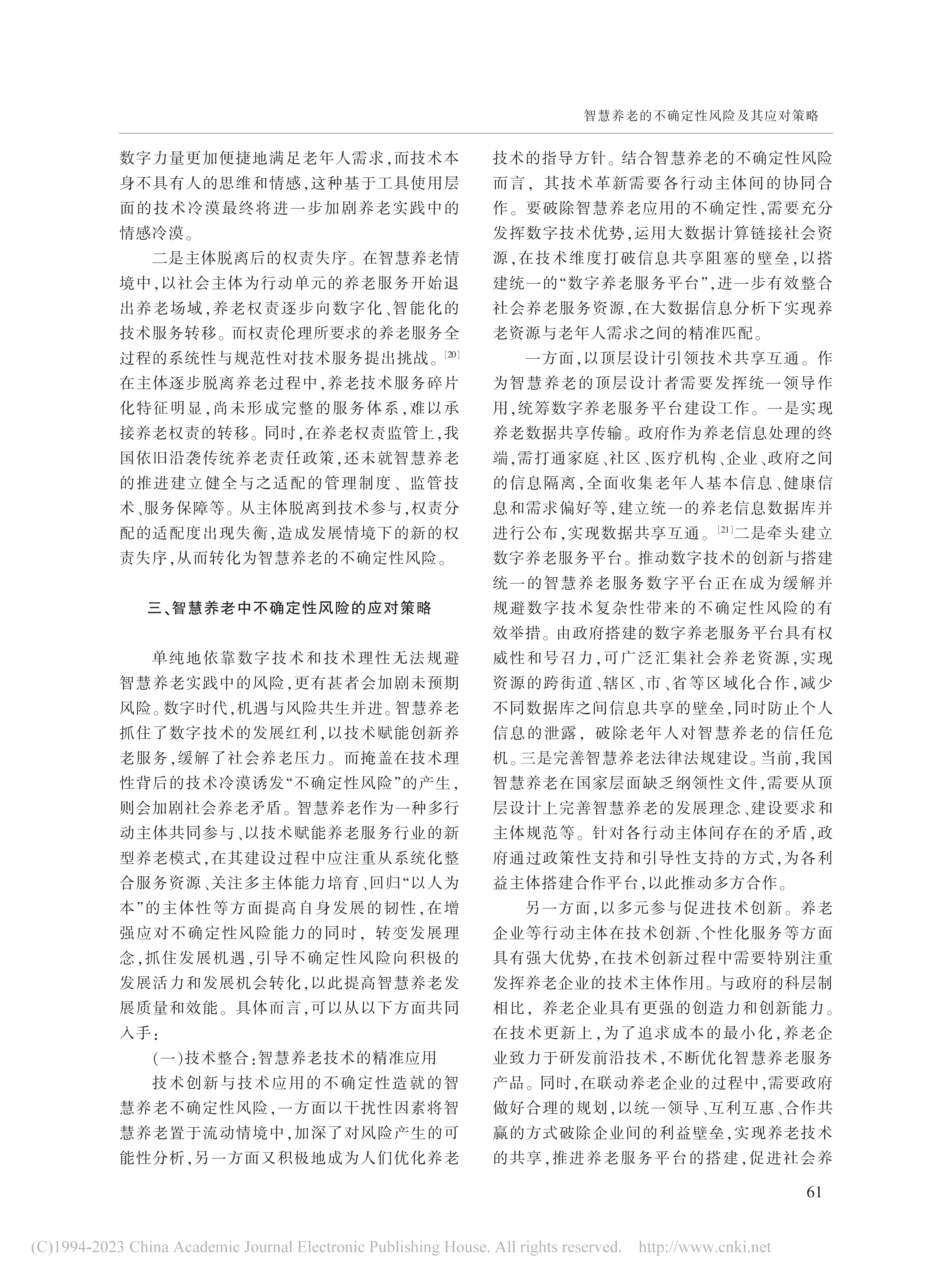 近日,中心特邀研究员文军教授与华东师范大学社会发展学院研究生刘清共同发表的载于《江淮论坛》2023年第5期文章《智慧养老的不确定性风险及其应对策略》被《新华文摘》2024年第4期全文转载。文章通过分析指出智慧养老面临数字养老技术应用的非预期后果、行动者数字胜任力脱嵌与技术理性下的养老异化等不确定性风险。破解这些风险需要从技术整合、主体赋能和情境创设三个维度出发,以需求为本推进数字技术的精准应用、提升多元主体数字胜任力、倡导回归生活的服务模式。本研究为智慧养老的高质量发展提供了理论借鉴与行动参考,对于推进我国养老事业的发展具有重要意义。