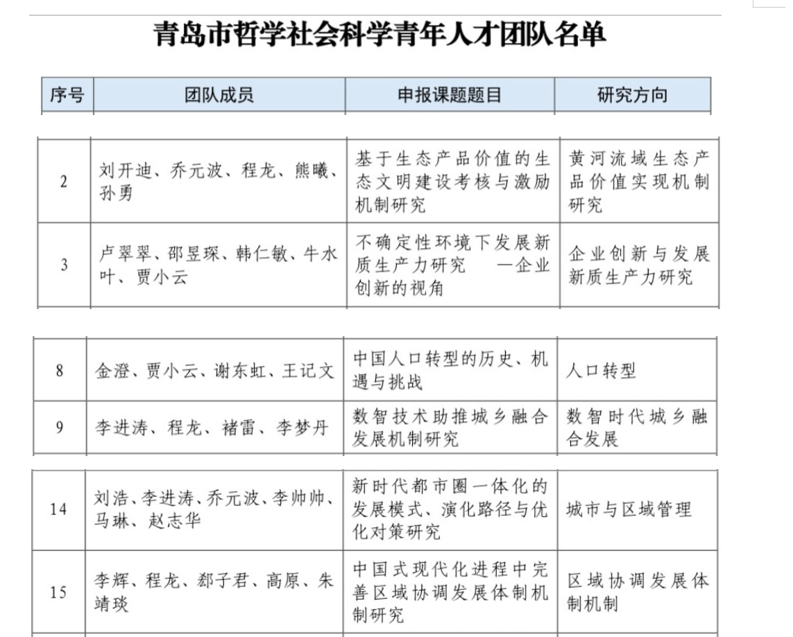 近日,青岛市社会科学界联合会公布“青岛市哲学社会科学青年人才团队”名单。中心研究员李进涛作为团队负责人,中心研究员程龙、褚雷、李梦丹作为团队主要成员申报的《数智技术助推城乡融合发展机制研究》入选团队立项。中心研究员程龙、贾小云、谢东虹、李进涛等作为主要成员的5支项目也分别入选。