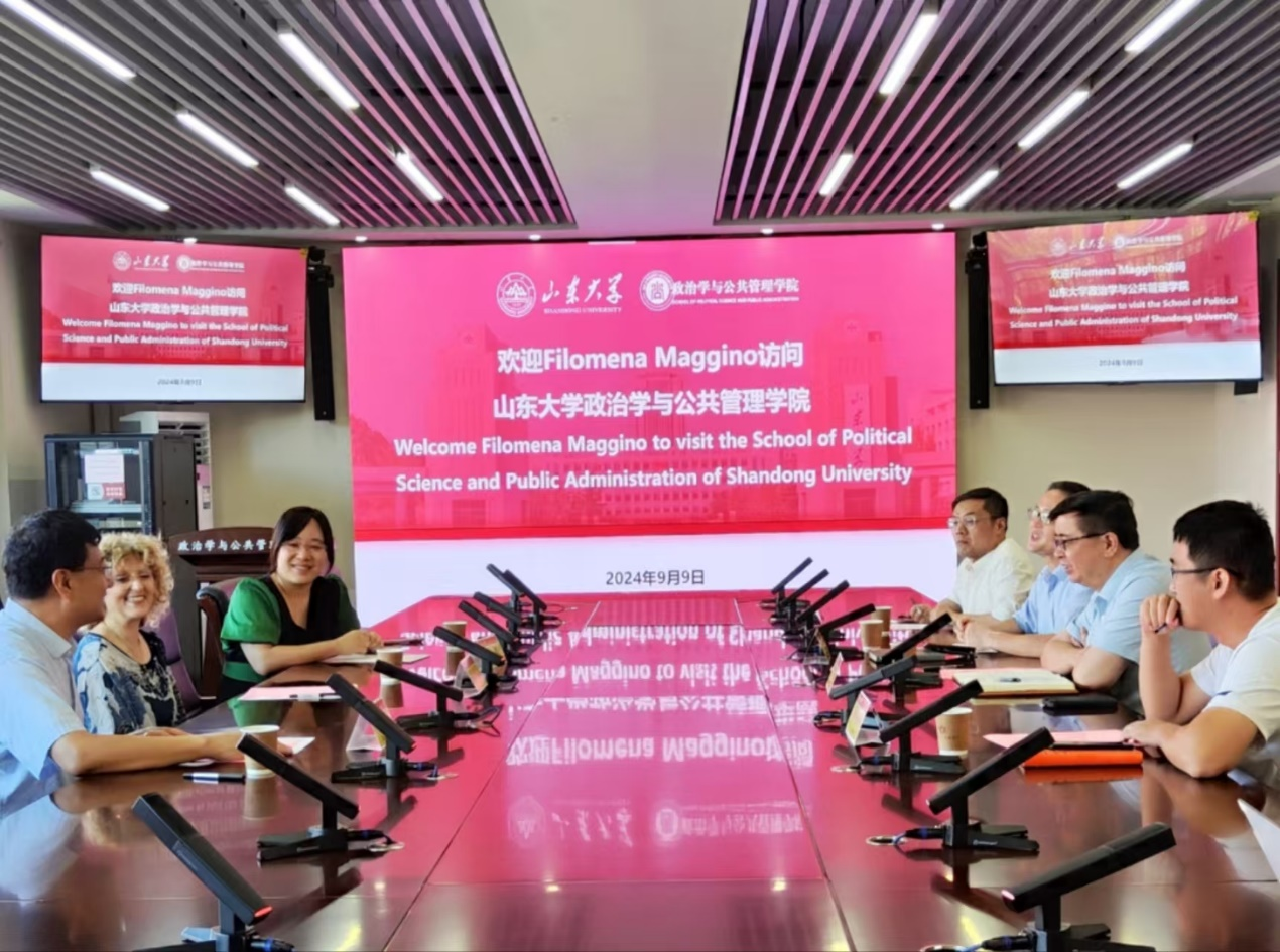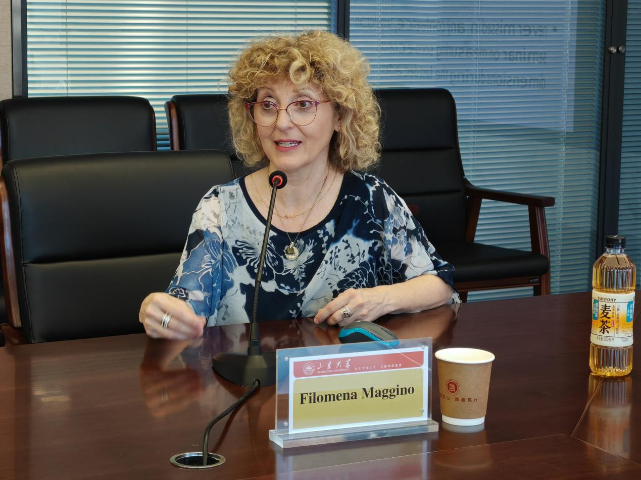 访问期间,山东大学校长助理、生活质量与公共政策研究中心主任邢占军会见了Filomena Maggino教授,政治学与公共管理学院院长马奔、副院长朱贵昌等与Filomena教授进行了座谈,就开展持续的合作交流,尤其是聚焦生活质量与公共政策等研究前沿进行研究合作、师生交流等交换了意见,中心相关专业学者李进涛、黄晴、褚雷等参加了座谈交流。