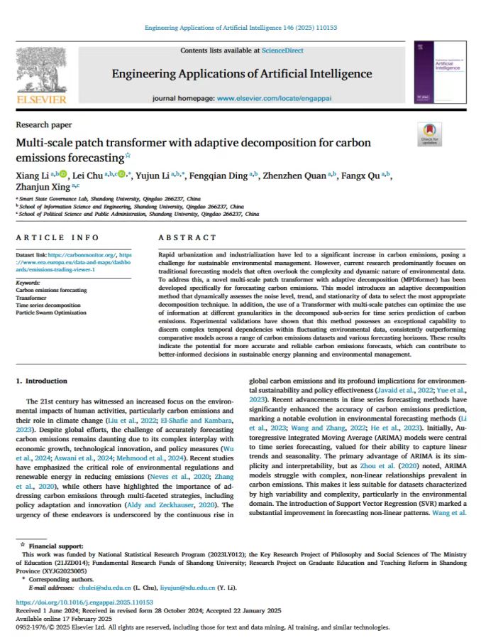 近日,中心研究员褚雷团队在SCI一区期刊Engineering Applications of Artificial Intelligence上发表了题为“Multi-scale patch transformer with adaptive decomposition for carbon emissions forecasting”的论文。