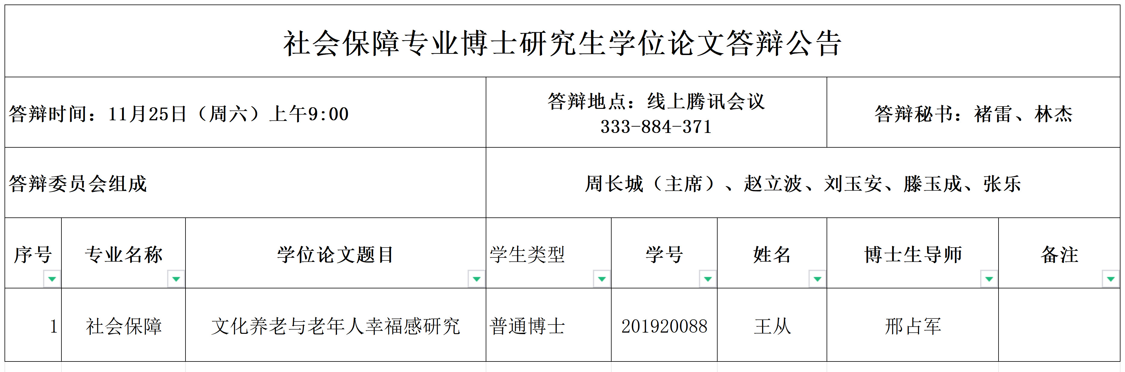 [答辩公告]社会保障专业博士研究生学位论文答辩公告